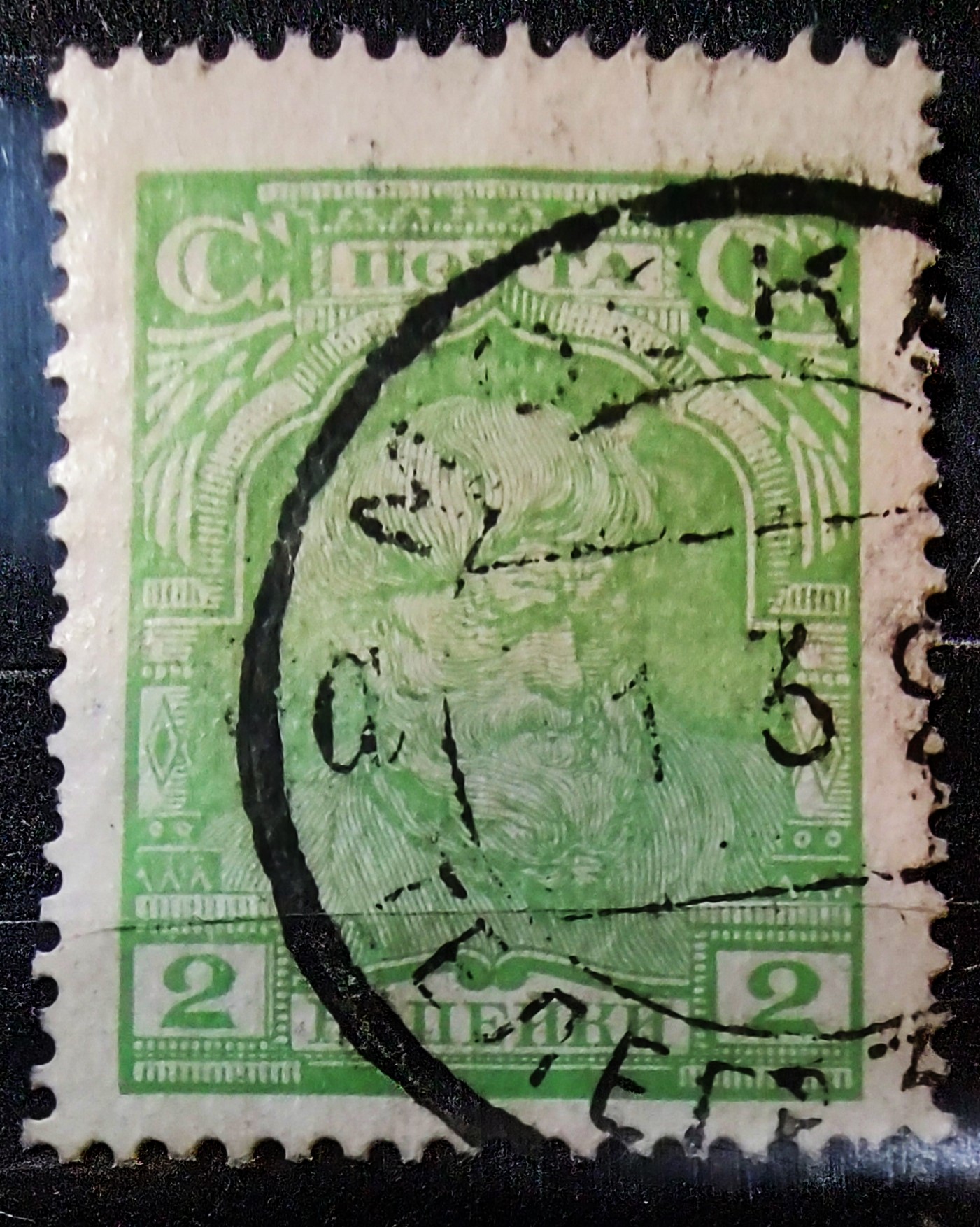 Цікаво: саме такі обличчя стали «візитівкою» ранніх радянських постійних марок. Замість монархічних орлів — простий селянин. Замість золотих прикрас — стримана зелена палітра. Верхній напис «СССР» і «ПОЧТА» зроблений строгим шрифтом без зайвих «завитушок» — це був маніфест нової ери поштової справи.