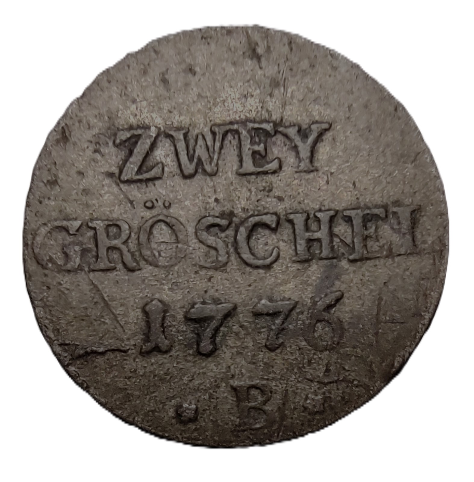 А ось ця монета — чистий патріотизм! Напис «ZWOLFY GROSZ 1776 B» представляє класичний польський грош, викарбуваний у часи, коли Польща балансувала між величчю та серйозними викликами.