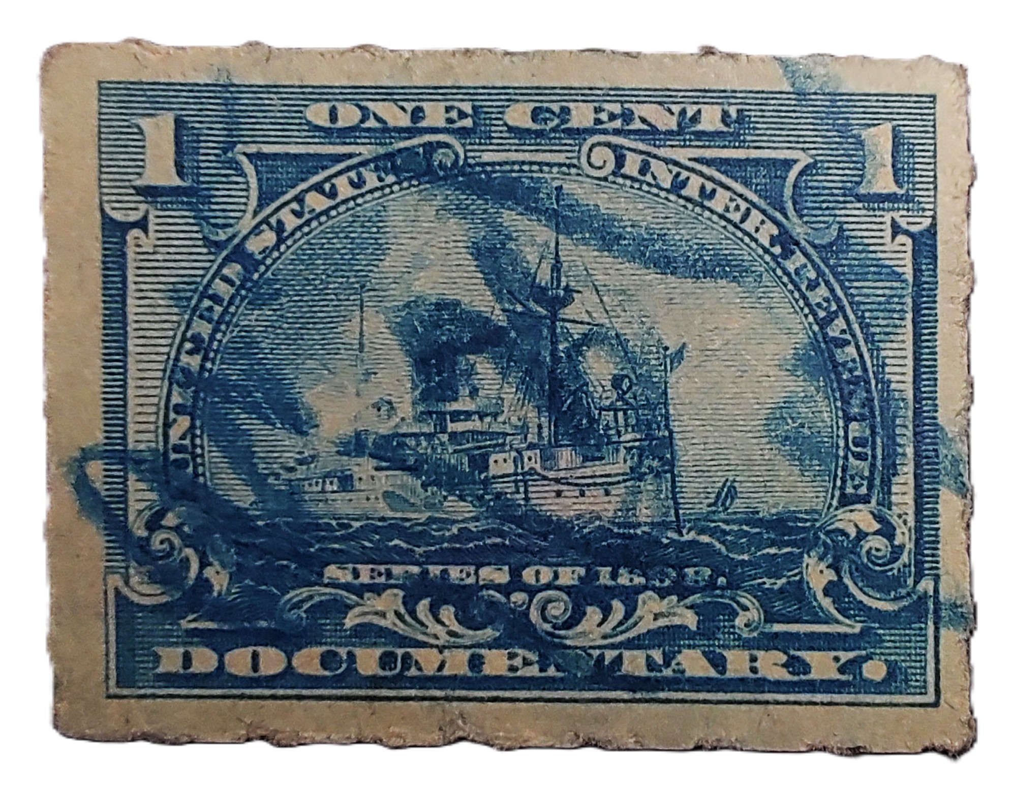 1-центова документарна податкова марка США серії 1898 року «Лінкор» (Scott #R163). Ці марки були випущені для збору коштів на іспано-американську війну.